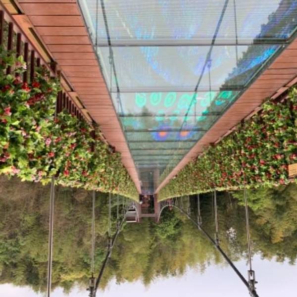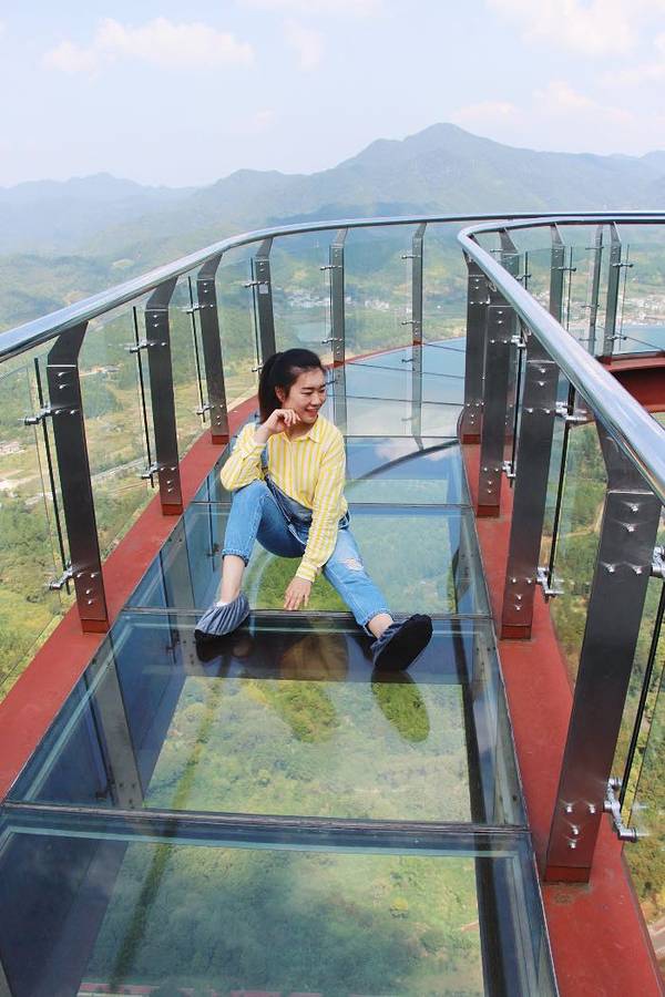 每人带着一瓶水就开始爬山了,在山上一共三个玻璃栈道,一个是全透明长60-80米左右的玻璃栈道,一个是u型10米玻璃栈道,一个是两山之间透明+踩碎和声效效果的玻璃栈道,三个栈道需要一次性购买,15元/人。