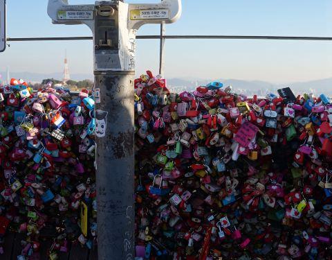首尔塔的索是我看过最多最美丽的,颜色各异的索挂满了一面墙。唯一的缺点是秋夜里寒风阵阵,没法停留太长时间,夏天过来可以登山上塔顶,悠闲的看看风景。