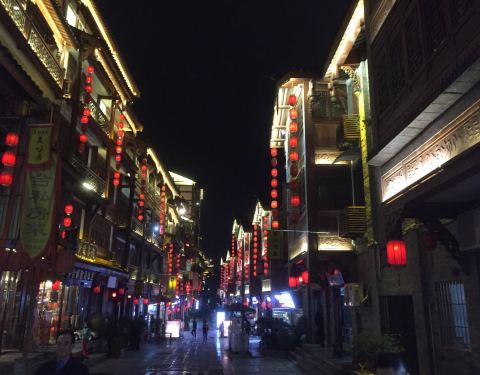 就在1915广场的上面,街道两边是古色古香的房子,房檐上都挂满了灯笼,夜晚的景色很迷人。街道的旁边还有一些卖烧烤的,很热闹。
