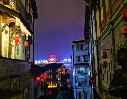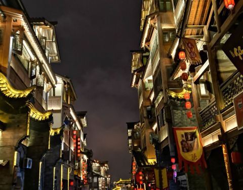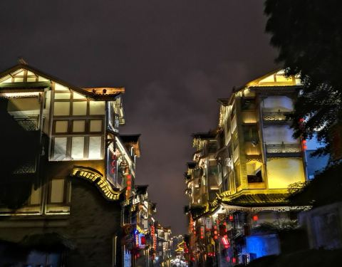 夜晚降临,华灯初上,热闹繁华。街道青石铺路,餐馆皆是木质小楼