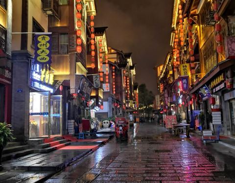 仁怀茅台镇的饮食一条街,街两旁是大大小小的各色餐馆,大多是贵州各少数民族特色餐饮。街道青石铺路,餐馆皆是木质小楼。夜晚降临,华灯初上,热闹繁华。