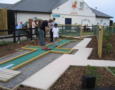 打迷你高尔夫球的后面的白色房子就是Lake District Coast Aquarium水族...