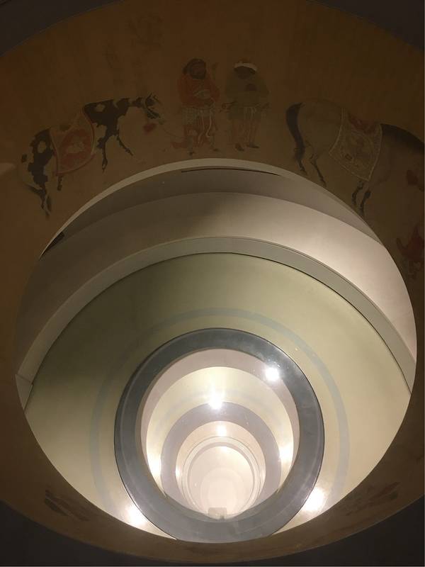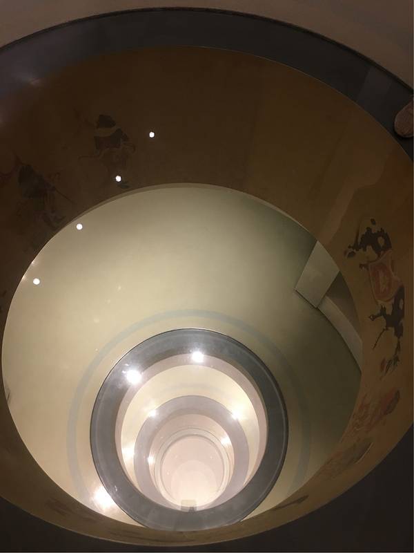 搞活动时买了一张票,现场购票150,感觉有点贵啊,尤其是对我这种没有艺术细胞的人来说。 要不是买的那张票,还真不知道上海还有这样一个地方,虽然在中环上开来开去总看见那么一片欧式建筑,但是完全不知道里面是什么。原来里面有个酒店有个商场有些写字楼还有一个艺术馆! 秋高气爽的日子,带小朋友去艺术熏陶,再好不过了。 前台打卡成功,除了手机,其他都要寄存。过了安检,先坐电梯去5楼,从上往下参观。电梯有点慢,然后当电梯门一打开,惊呆了!面前是整面墙的《江山揽胜图》,比当初中华艺术宫的《清明上河图》短点,但是春夏秋冬慢慢揽过,效果更好! 里面的展品以字画为主,我们当然看不懂,匆匆而过,但对于偶尔出现的一些装置却情有独钟,尤其是从5楼通到1楼的那个玻璃地板,每个小朋友都忍不住去趴着看看。站在1楼的中心点那里说话,能过听到回声,但是别人听不到,很神奇! 我觉得,这里值得一去。