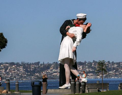 历史经典画面!来自二战胜利的纪念之吻! 然而,了解了真相后才知道原来这是个强行的吻…这,俩人不认识呀。。。 反正,如今这座毅力在USS航母对面的雕塑已经成了众多游客的打卡之处,是敞开式的景点,且免...