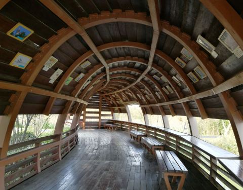 在扬州运河三湾风景区,有一船形的三湾书院,文艺青年可以体验画舫船外形的城市书房, 书店采用了以鸟巢鸟笼为元素设计的灯罩和以生态树为原型设计的休息凳椅 最值得一提的,就是城市书房四周的墙壁设计了。墙壁都是以一条一条的木板拼接而成的,而这些木板是用废弃的船只上面拆卸下来的旧船板,经过打磨、加工之后制成的。 仔细看可以看到上面非常多的孔洞,这些孔洞大概就是岁月留下的痕迹了。