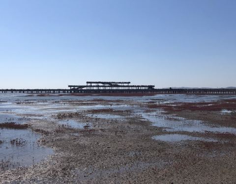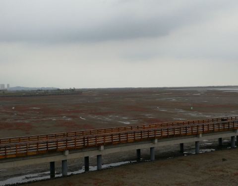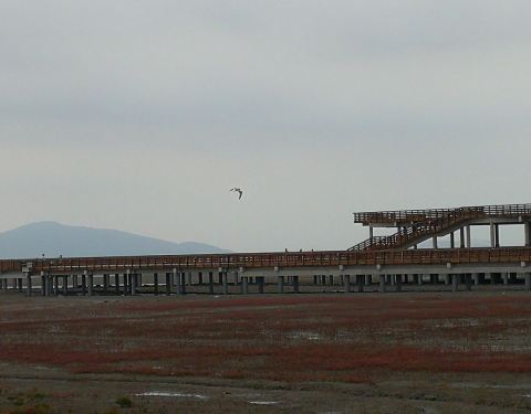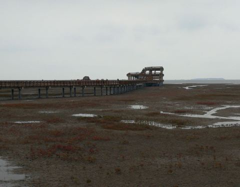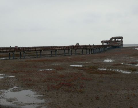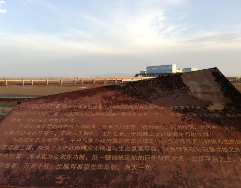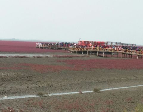 兴城的红海滩是最近两年兴城新建的旅游景点,由于红色的植被刚刚种植,所以还没有形成那种连成一片的红海滩,但是未来几年植被长大后应该是很漂亮的景点。景区除了红海滩,还有模拟军舰建造的栈道观景台,是看海...