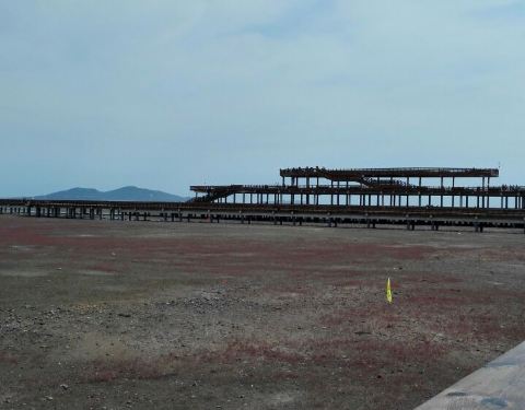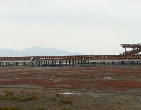 怀着好奇的心情,一行人顶着烈日来到兴城红海滩景区,远眺看到景区规模不小,进入后发现其实并不是很大,照片上红海滩的美景并没有展现出来据说是来参观早了还没有到时候。不过栈道还是不错的,延伸到尽头栈道有三层可以很好的欣赏美景。