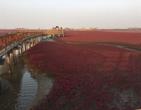 红海滩风景区位于盘锦,红色的碱蓬草,一直延伸到天幕尽头,俨然是一片红海,蔚为壮观