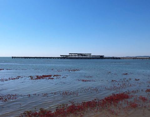 兴城的红海滩是最近两年兴城新建的旅游景点,由于红色的植被刚刚种植,所以还没有形成那种连成一片的红海滩,但是未来几年植被长大后应该是很漂亮的景点。景区除了红海滩,还有模拟军舰建造的栈道观景台,是看海休闲很好的地方。