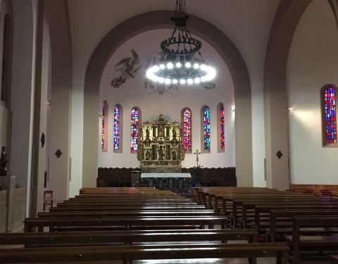 外墙全是石头建的,很有厚重感,里面比较简约,有几尊雕塑值得看看,很喜欢细长的彩色玻璃窗透出来的光线。