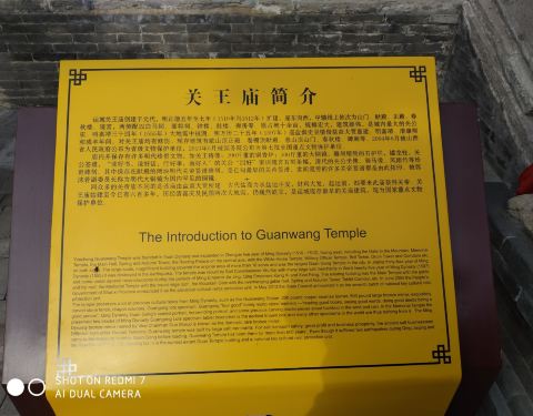 运城,古称河东,缘盐生,恃盐兴,因盐名,创建于元代,历经元明清三朝,至今六百余年,先前的不名小村,其后的河东名城,向被誉为‘三省藩会,万方辐輳’,‘九曲黄河一明珠’。古代盐商为求盐运平安,财利大发,起运前,都要祭拜关帝,故此建城时,始建关王庙,明朝扩建,后毁,万历二十五年,巡盐御史偕盐商大贾重建,后屢有修饬,风雨六百年,巍然屹立,是运城现存最早的关庙建筑,值得一提的是,这里有两块明朝关帝签谱碑刻,是已知最早的关帝签谱。关帝灵签始于南北朝,基本定型于唐朝,后期是苏轼撰写定稿,这倒是头一遭听说,求签问卜,寻求庇佑,民间流传至今,已有一千多年的历史,算是关公文化的组成部分,还有广泛见于庙宇中的‘四好’箴言碑,‘读好书,说好话,行好事,做好人’,相传据说可能是关公教子所言,和诸葛亮《诫子书》实有此言,大不同。至于那面国内罕见硕大无比重500斤的明代铜镜,不见实物,只见纸质照片,真实大小,仿真效果不错。高考刚刚结束,庙内香火淡淡,香客寥寥,老庙古殿,闹中取静,也算一方佳处。