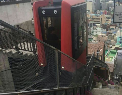 草梁168阶梯其实是为了方便真正居住在山坡上的居民而设计的一段路还有一个3分钟就可以到达的为岁数大的人乘坐的小型有轨电车。这里位于山坡上可以看居民居住的彩色房子俯观釜山城市景色远眺广安大桥。 楼梯右手边有个入口,进入有电梯直达坐有轨电车上车口。有轨电车可以停三站:工作室、柳致环邮筒、顶层展望台,每一站旁边都有些可以拍照的地方,顶楼是观望台。
