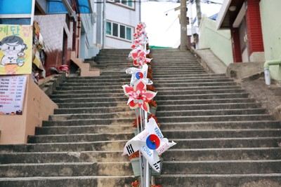 釜山街头艺术小景 釜山,是一个小小的海港山城,在主干道两边,都是高高低低的楼梯,延伸向两边的居民区。在釜山这个小城市逛的时候,经常会在街口转角,不经意间,发现一些可爱的街头艺术小景,这些,小小的景观,代表着这座城市的审美和艺术欣赏品味。给这座城市增添了,很多艺术气息。