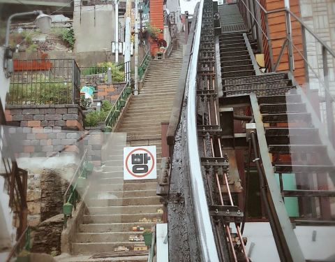 ...阶梯旁边,电梯是斜着往上走的,方便居民上下,也成了一个景点,到上面可以俯瞰整个城区和海,非常好
