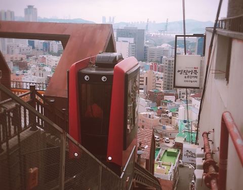 这个景点其实知道的人不多,但很有意思,它位于草梁洞的居民区内,其实这里就是平时居民们上下必走的台阶路,韩国的地势关系,有好多上下坡,有些很陡,这个景点就是,很陡,有168个台阶,现在有建电梯在阶梯旁边,电梯是斜着往上走的,方便居民上下,也成了一个景点,到上面可以俯瞰整个城区和海,非常好。