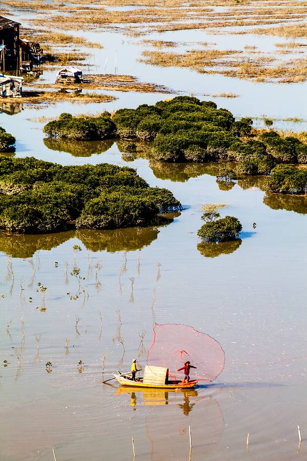 红树林,位于霞浦县盐田乡红鹅湾村,面向大片滩涂和海湾,是摄影爱好者的打卡地之一。这里隐藏着一片红树林,不为人知,用唯美两字来形容这片红树林再恰当不过了。说是红树林,实际上触目所及是一望无际厚重的绿,并不红。之所以叫红树林,是因为红树科植物体内含有大量“单宁”,它的树干遇到氧气会变成红色,它的树皮提炼出的“单宁”还被用做红色染料,“红树”之名由此而来。这里是霞浦的红树林主要集中地带,也是盐田连家船民生活的地方。连家船渔民在红树林中穿梭,开始年复一年,日复一日最原始放帘打鱼的劳作。湿地红树林,远山近水,烟波浩渺,舟行其中,如梦似幻。当地专门建造了观景与摄影平台。为了营造更好的摄影效果,还专门聘请渔民,摇舟于海湾,撒网捕鱼。船上的渔民成了职业的“演员”,观景平台上的“导演”,拿着喇叭,指挥渔民,摇舟、撒网、收网,一次又一次,无数次重复,满足一批又一批游客的摄影要求。当山上观景台上的“导演”确认摄影师们都准备就绪之后,拿着喇叭“一二三”一声令下,船上开始撒网,只听见观景台上咔咔咔地响个不停,真有影视拍摄现场的感觉。鹅湾红树林简介霞浦鹅湾红树林