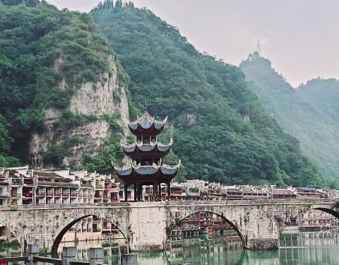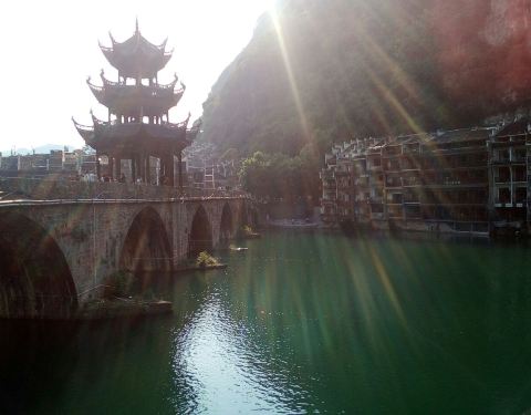 镇远古城,石屏山下,祝圣桥,古老的古桥上一座凉亭,站在桥下,桥下舞阳河缓缓流过,河边客栈阳台上游客安逸地看水,河边的青山映在阳光里