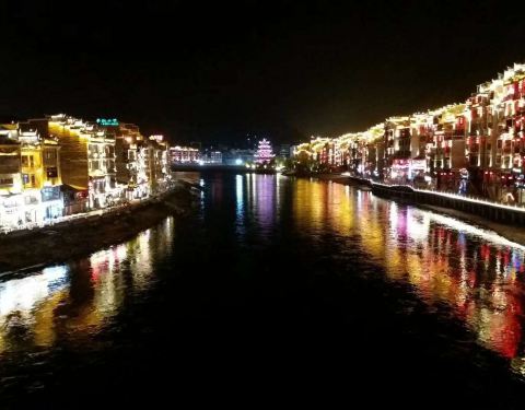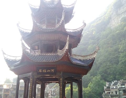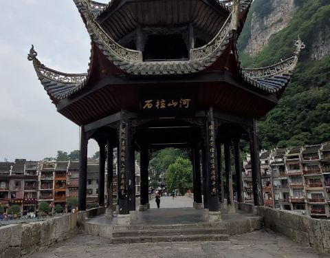 是舞阳河上的标志性景观之一,位于青龙洞景区旁,祝圣桥正中间,是一座重檐翘斗、三层十八角的楼阁,...