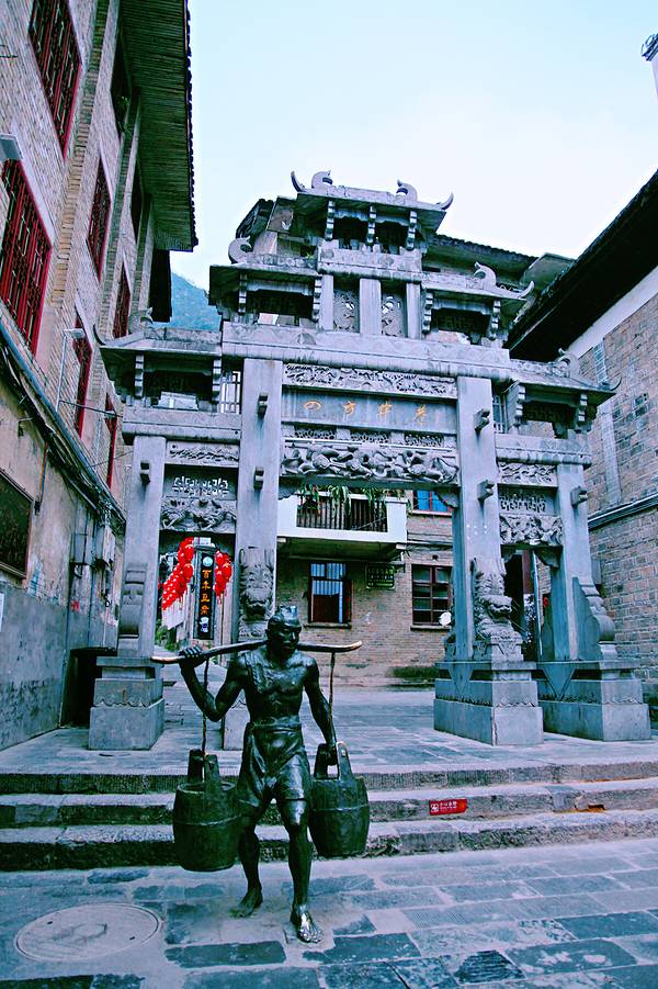 石屏山下,镇远府城中的重要古巷道,也是它们之中最靠近祝圣桥的一条,虽然不宽,但甚有意义。巷因其中有四方井而命名,在主街入口的牌坊下,还有古人挑水前行的雕像,栩栩如生。沿着巷道的台阶往玉屏山上登,会经过向氏、杨氏、付氏等古民居,建筑特色各有千秋。