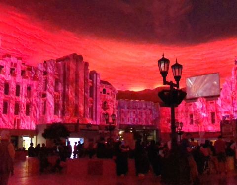 有一个坐在车上看(不)恐怖小故事的游戏比较适合我们:)过山车、蝙蝠侠4d电影有点恐怖,不适合我们这种胆子小的人,我还是比较适合迪斯尼,胆子大的青年人会比较喜欢,很多其他项目我们都没敢再玩了。室内空间很凉快,有很多餐厅,有中餐咕噜肉,价格与阿布扎比酒店里的餐厅差不多,可以接受。整体环境挺好的,很舒服。