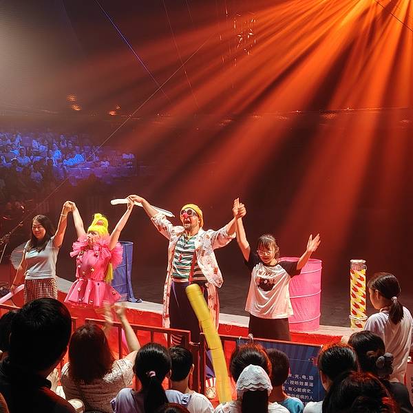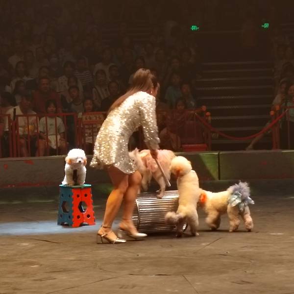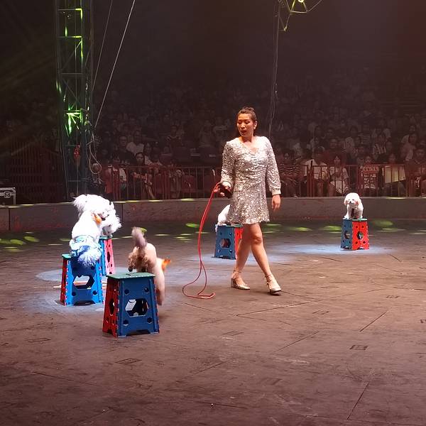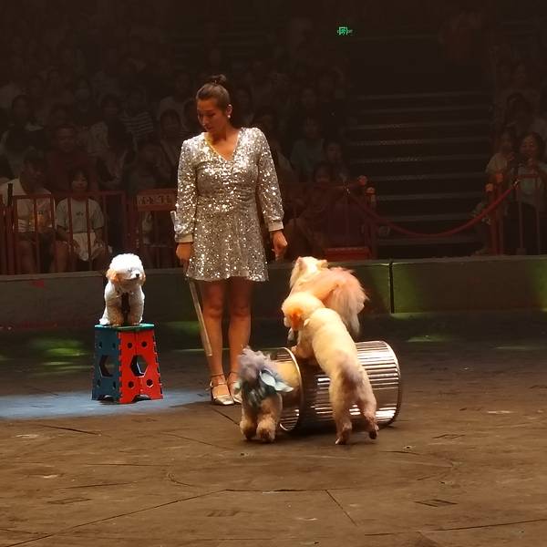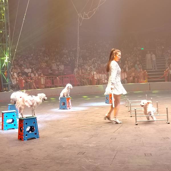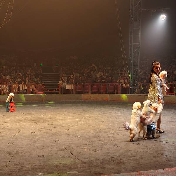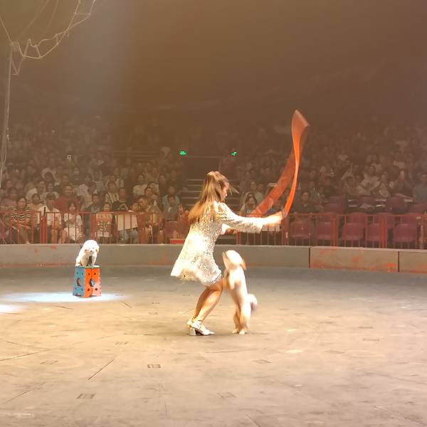 之前在南宁方特东盟神画门口的大马戏《海丝传奇》里,动物表演只有马,以及几只狗,狗的表演还是很可爱的,转场时,有小丑在搞气氛。