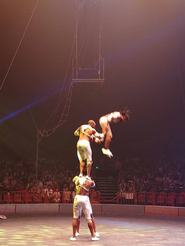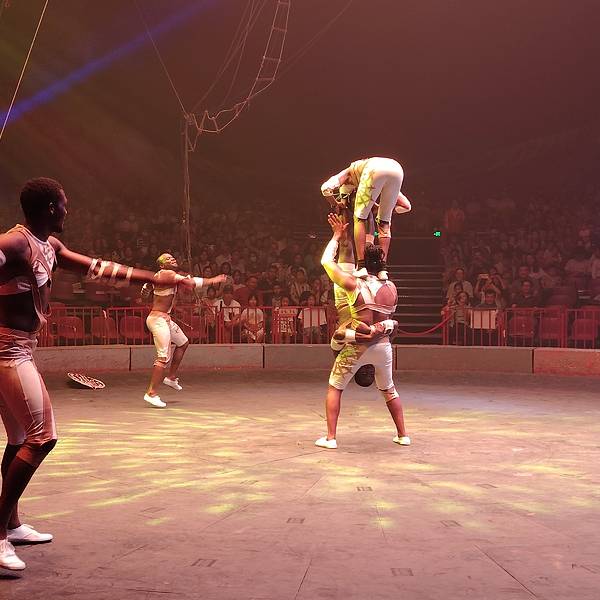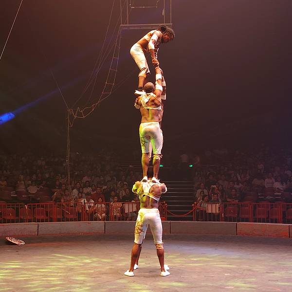 绳索如丝悬夜空,黑人叠塔破苍穹。这是在南宁上演的大马戏《海丝传奇》的两个节目,男女双人的高空杂技,还有6个黑人演员叠罗汉表演,真刺激。