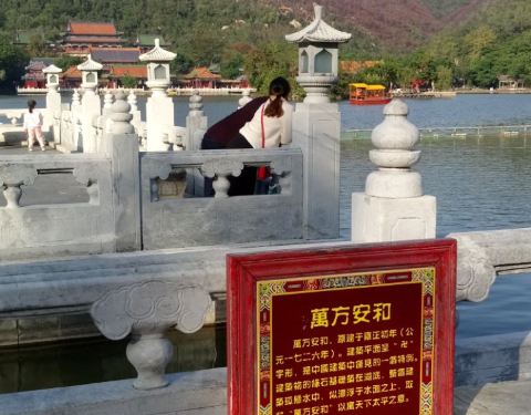 非常优美的自然景观,虽然是仿照的,但是很逼真哦,值得一看。万方安和的牌子用显眼的红色立着,特别有中国的喜色,字迹用金色,在阳光的照射下显得非常威力,不错。