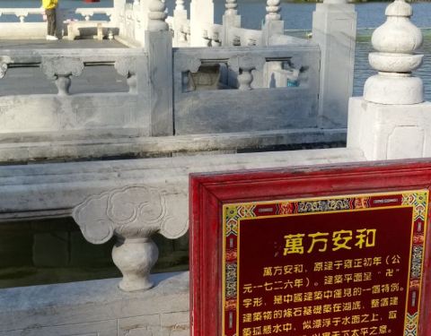 万方安和曾是圆明园40景之一,圆明新园里从这个景点开始进入江南园林建筑群。从远处就看见这座水上建筑,是一个半封闭的白桥,之所以是白色,因为曾经的万方安和为汉白玉建筑。 从卫星地图看是个卍字的形状,不过...