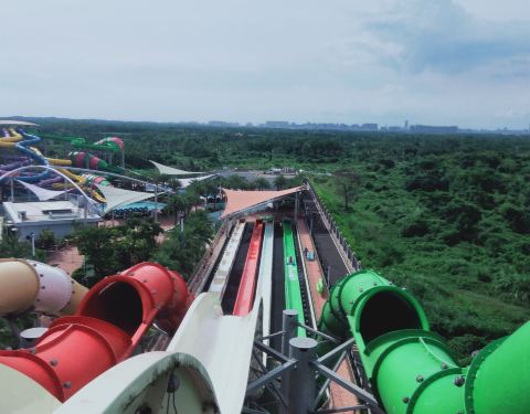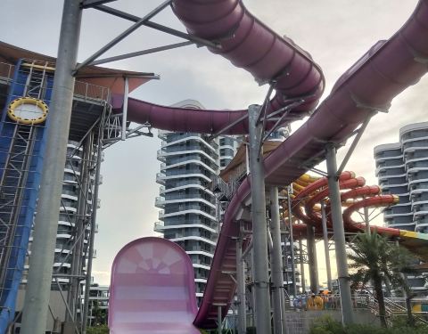 图一是可以带小朋友在里面玩的 图二是绿色旁边那个比较刺激 图三是头向下抓着道具下滑 等等地方算是挺大的就是一整天都在爬楼梯排队 但是我也玩了所有大型项目挺刺激的可以跟家人一起去玩性价比也挺高的 但是一般都会租一个箱子放东西大的40小的30要去可以直接买大的 整体来说光脚到处跑腿很累但是很高兴很刺激 今天刚玩完我一般都不评论这些景点,但是我查的时候评价都不是很详细就很难受,想着补一点 玩前不用带眼镜去,因为一般这些游戏都是不给带眼镜的 玩后那里有热水可以洗澡但是没有沐浴用品,精致的可以带上沐浴露洗发水毛巾 还可以带点东西吃玩完后会很饿要提前想好去哪里吃 因为我去过亚特兰蒂斯的水上乐园所以对比起来可能就感觉没有那么惊喜的感觉,但刺激还是有的如果我之前没有去过其他水乐园我还是会觉得这个性价比非常高不到两百的价格非常OK了 PS如果想带手机进去拍照记得买了手机套再去不然里面贵