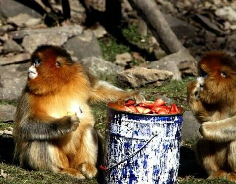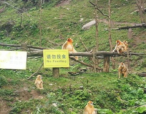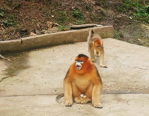金丝猴的乐园,近距离观赏猴王。从景点大门到看金丝猴,步行来回一个半小时。看到年青的一家三口负责喂金丝猴,基本2个小时喂一次,女的切西瓜,黄瓜,胡萝卜,男的用桶提着到小山坡扔撒。后面花生几乎是猴王独享。