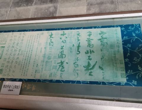 大家对唐诗就很熟悉,或多或少都会背几首李白的唐诗。诗你是读过,但你见过李白写的字吗?来到青莲寺一楼,你就可以亲眼看到李白写的字。据保安介绍这是李白写的维一留世的真迹,请看图一图二,有几十位皇帝名人在上面盖章题字做证明。真迹保存在故宫博物院,太白楼字是复制品但已经是弥足珍贵了。对面橱窗里还有一幅字图三图四,据说也是李白写的,但是没有证实。