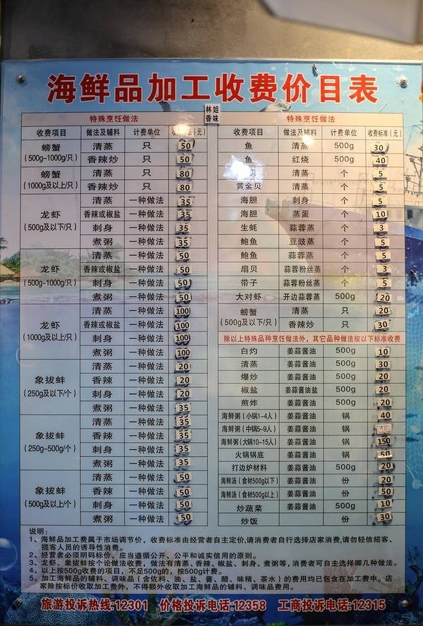 从第一市场采购一番海鲜之后也千万别担心,一旁的新民街里有很多的海鲜加工店可供你选择,而这一次我们选择了位于新民街已经有21年历史的老店—林姐海鲜;这家林姐海鲜在三亚也有大有来头,更是荣获海南乡村旅游文化节美食博览会“十佳小吃”、“特色小吃”的称号;而且你可以放心的是,他们家的海鲜加工都是明码实价的写在单子上,绝对不会乱收费的。
