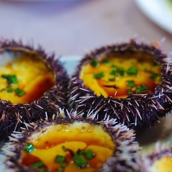 海胆蒸蛋,算是比较传统的一种吃法,能尽量保证其美味和营养都不会流失。将鸡蛋放入海胆中一起蒸制,再淋上几滴鱼露,撒上一些小葱碎,样子很精致,营养价值也很高,口感细腻爽滑,清淡可口,味道甚好,而且经过大厨的精心加工,完全没有海胆的腥味。