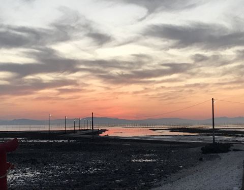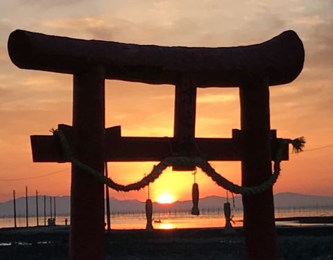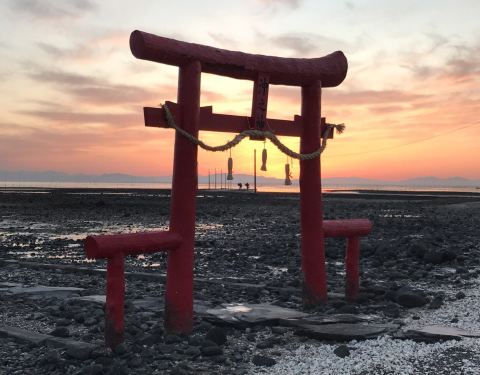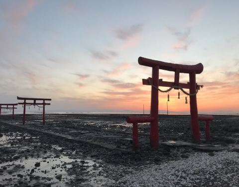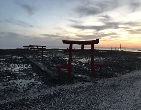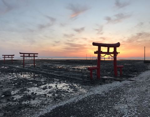 海に三基並ぶ鳥居があります⛩⛩⛩ 朝日狙いで見に行きました。 この時期は一番手前の鳥居から日の出見れました。 干潮の為、次回は満潮のタイミングで見たいです。