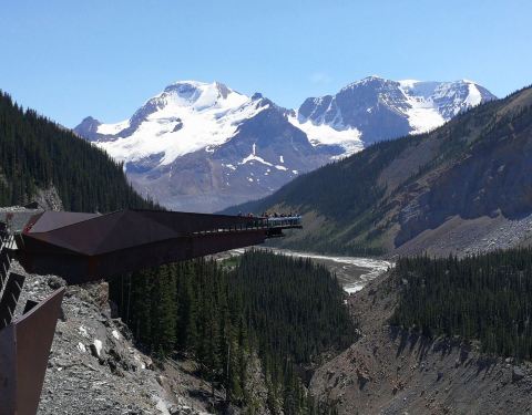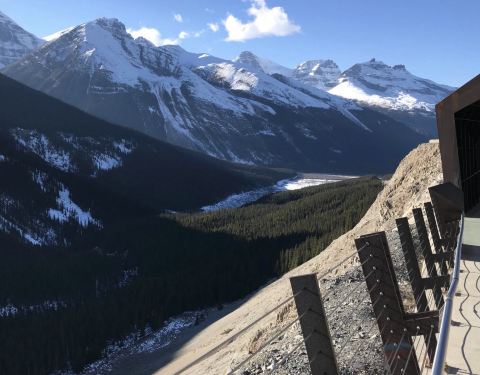 冰川天空步道(Glacier Skywalk)坐落于加拿大落基山贾斯珀国家公园(Jasper National Park)的辛华达峡谷上方,步道分为两个部分,即突出于悬崖之上的全透明U字型玻璃桥和悬崖边的环山步道。