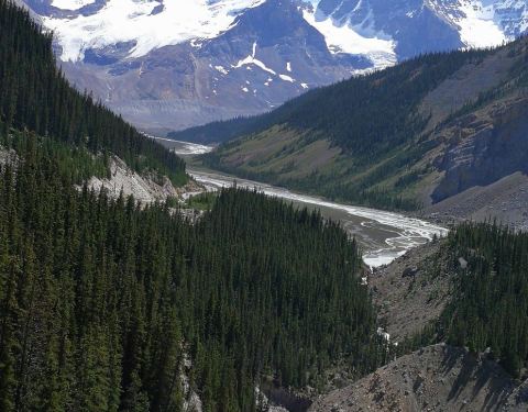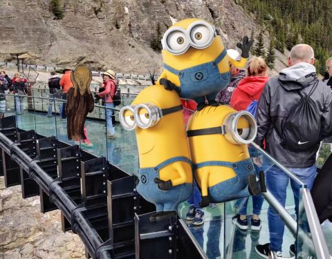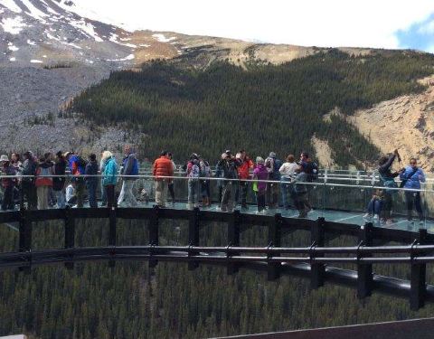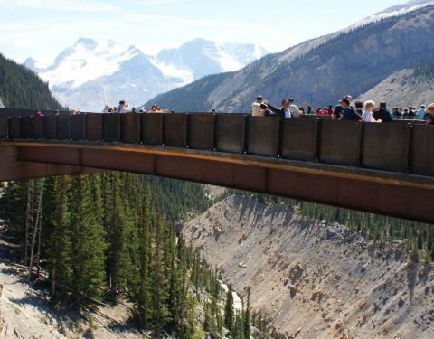 玻璃桥:从露易丝湖沿冰原大道北上,过了弓湖,下一个景点就是令人振奋的玻璃桥---冰川天空布道(Glacier Skywalk):游客可以沿着完全开放的峭壁步道抵达辛华达峡谷(Sunwapta Valley)上方280米(918英尺)的玻璃地板观景台。这一壮观的景点被誉为全球最独特的生态系统之一,同时也是了解生态学、地质学、冰川学知识以及哥伦比亚冰原地区自然历史的绝佳之处。