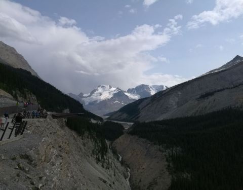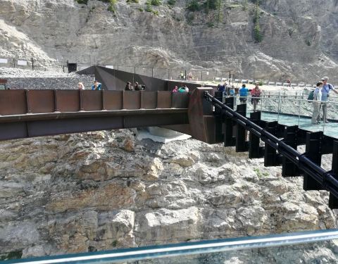 我们原先只是为了上冰原才买了这个天空步道的套票,来了后发现也不虚此行,这座玻璃桥从高耸的岩壁上呈U字型伸展出去,脚下是几百米高的峡谷,让人肾上腺素大量分泌,真的好刺激