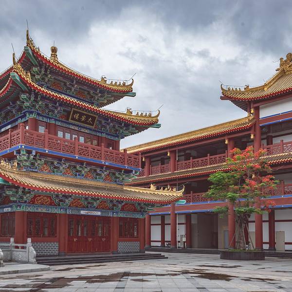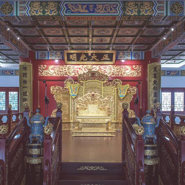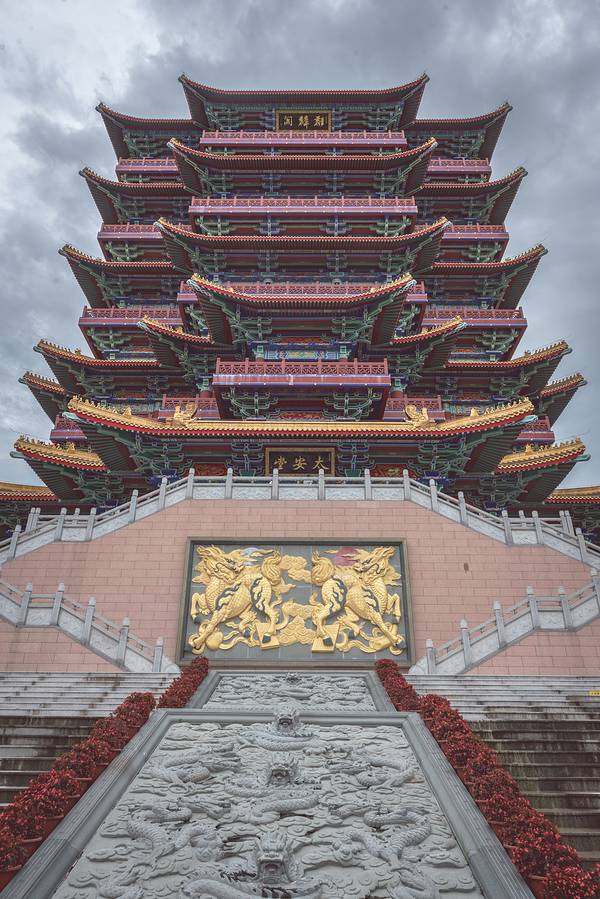 在汕湛高速上路过潮州沙溪的时候,常常会被一个气垫磅礴的仿古建筑群所吸引。这是太安堂小镇,是以中医药文化为主题的博览馆。建筑群的几座楼阁有的像滕王阁,有的像甲秀楼,都是外观精美的古建筑。但这个仿古建筑群不是简单仿制,而是重金请了故宫博物院修复建筑外观的老师傅来根据原建筑来的工艺来上色制作。设计风格突出五大元素:来自太医院的宫廷元素、来自潮汕的岭南元素、来自海派文化的江南元素、集成三大名楼的建筑元素和来自太安堂的医药元素。入口左手边是仿建甲秀楼的太安楼。中间这座便是以滕王阁为原形建造的麒麟阁。座北朝南,总高70.13米。主体采用明五暗九的层级关系,外观五层五重檐,内含四个夹层,实际共九层,有九五之尊之寓意。建筑基座采用三层分级的形式,层层收缩层层上升以烘托建筑的高达与宏伟,使得楼阁的稳重感与庄严感更加强烈。麒麟阁内有个送子观音的雕像,因为太安堂生产的麒麟丸是专治不孕不育的药丸,在东南亚卖得非常好。这里的建筑非常华丽,很适合拍古风照。麒麟阁三楼有个仿造故宫的“皇位”,供游客拍照的建筑在第3、5、7、9层的檐下出挑环廊,为登高临眺提供良好的观景平台与视角。使楼阁不仅是被观赏的景物,同时也是观赏风景的绝佳之处。