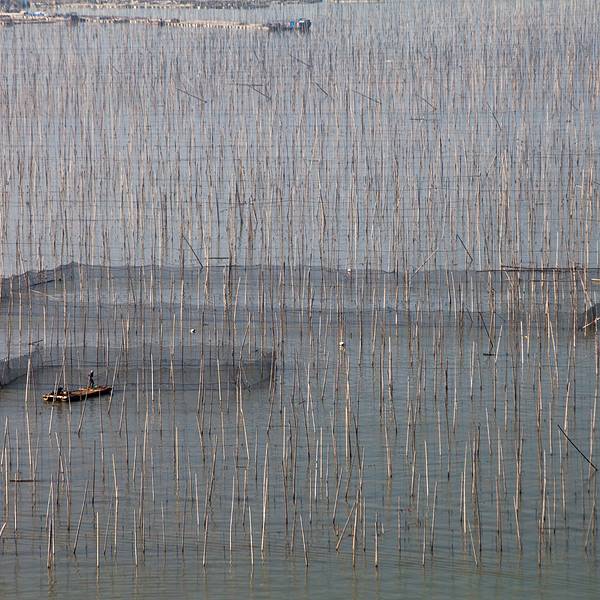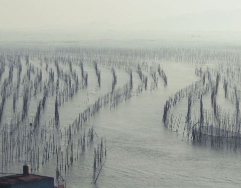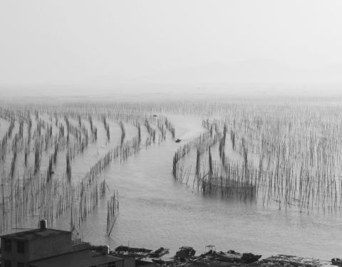 沙江镇历史悠久,风景秀丽,众多插在滩涂上的竹竿形成的优美线条,错落有致地排列在大小“S”形的港湾水道两边,构成一幅完美的霞浦滩涂风景。因天气不给力,拍出来的片子没有色彩,酷似水墨画。