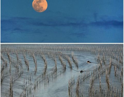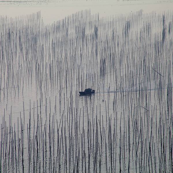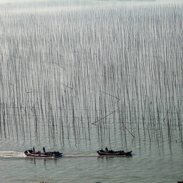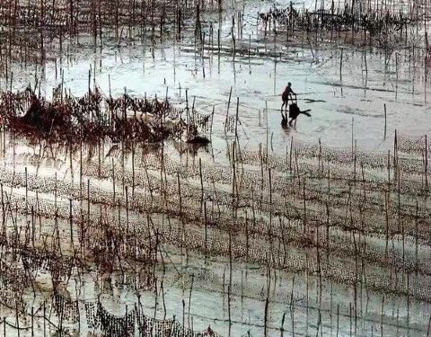 竹竿有致地排列在大小“S”形的港湾水道两边,构成一幅完美的滩涂风景。每当海带收成季节,竹杆上挂满晾晒的海带,来来往往的船只,在S形的竿影间繁忙穿梭,使得原本美丽的港湾,更加丰富多彩,水墨韵律更加美妙...