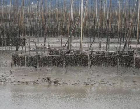 众多插在滩涂上的竹杆形成的优美线条错落有致,每当海带收获季节,竹杆上挂满晾晒的海带,渔民驾着小...