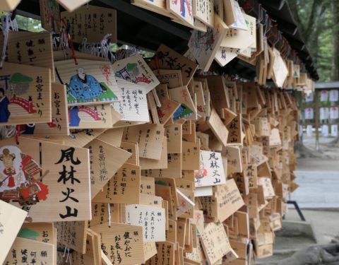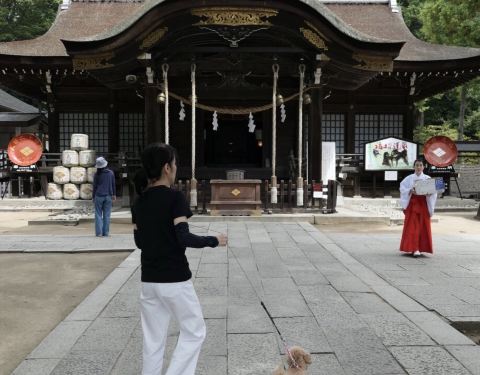 武田神社,古地“踯躅崎馆”遗迹,武田信玄的出生地。“甲斐之虎”头衔充满粗犷风格,然而宝物殿前竟站着一只石化的Hello Hitty,还养着乌骨鸡和两只施华洛世奇