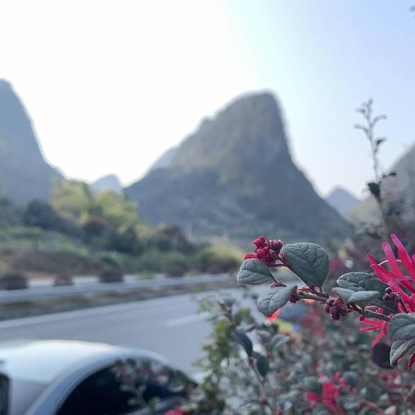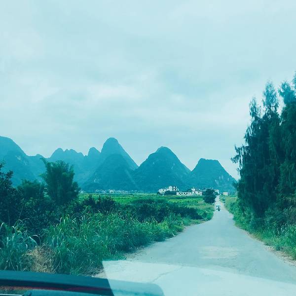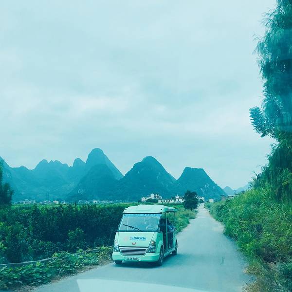 12:08达到阳朔站,大概有二十七八度的样子,有点微微的凉风,一下车就感觉心情豁然开朗,好舒服啊。还有很多小蜻蜓围在身边飞,瞬间就喜欢上了这里。我们一共是8个人,直接租了一辆9座的商务车到民宿,中间我们问师傅到民宿大概需要多久,我们听的是10分钟就到了,结果师傅说是的四十分钟,哈哈,这蜜汁口音。司机是民宿老板推荐的,师傅人很好,早早的就在车站等着了,沟通起来也非常顺畅,费用200元左右。从阳朔站到民宿的路上,会路过兴平古镇,可以顺路先到古镇去逛逛,打卡二十元人民币的背景图案。由于我们前一天晚上睡得不是特别好,大家都比较累,就选择了先去民宿休息。去民宿的路上,就感觉自己的文化水平已经跟不上这边的美景了,除了说“真好看”之外,也不知道怎么形容此时此刻的心情了。而且叶宝宝说了一句“桂林山水甲天下,阳朔山水甲桂林”,她们竟然一致认为后半句是现编的,我也是服气了,哈哈哈。路两边有很多长的像甘蔗一样的植物,我们都在猜是不是甘蔗,能不能吃,后来师傅告诉我们,这个是喂牛的,喂牛的,哈哈哈哈……