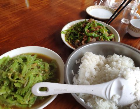 好多年前骑摩托绕龙泉山就来过这个地方,这次路过这里看到门口好停车就在这里简单解决午饭。这里离石经寺不太远,不像寺庙门口一排餐馆,这家是单独在一个路口上。 [环境]很简单,没有怎么装饰,后面还有一大片坝子。 [服务]就两个人在经营,看样子是夫妻,有点忙不过来。点菜也没有菜单,凭感觉点。 老板报的价格是荤菜25元,素菜15元,水煮肉片35元。回锅肉可以打70分,炒苦瓜80分。味道也不差,吃个便饭什么的也行,环境和服务就不要多做要求了。
