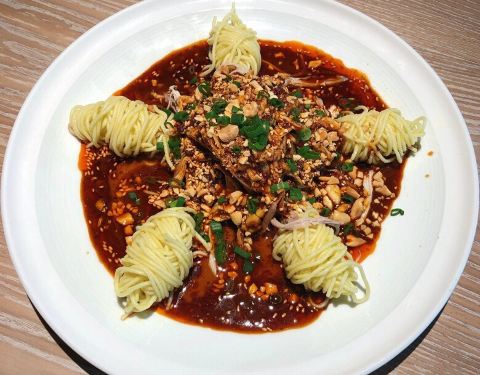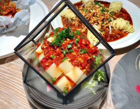 地址是北城天街B栋4楼 店里装修风格非常时尚都市,环境餐具也仍然保留了魔幻3D重庆的特色,而且好适合pie照啊! 凉面鸡的配菜好足,鸡丝好像比凉面都要多的样子,五角星造型可爱,味道够辣,喜欢辣的人的爱! 凉菜米豆腐的卖相很有特色,装的容器整的好有艺术感,外面加上那种干冰烟雾效果,远看还以为是甜品哎,酱料是红剁椒做的,味道不错吃之前可以稍微将酱料拌一下。