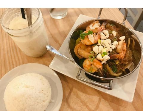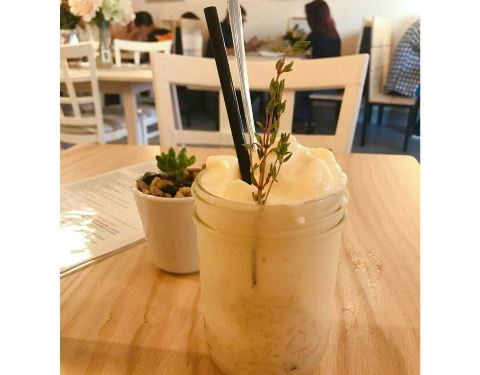 当当当!我自己去吃了这家美美的泰国菜! 果然!很好吃!!!推荐给大家! 装修风格超级清新,淡雅,但又设计感十足,给人感觉特别舒服,加分! 冲着甜品来的,在芒果沙冰和榴莲沙冰中纠结了很久,最后选择了榴莲的。满足!好吃!榴莲味道非常足!沙冰打到绵密和榴莲完美融合,底下是糯米