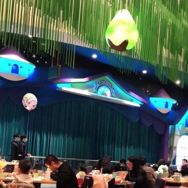 地方很大,同时有几个区域都可以让5-10岁的宝宝能沉迷其中,那样大人就可以好好吃饭啦前面的舞台定时会放熊猫三胞胎的动画片,小孩可以在前面一边吃一边看