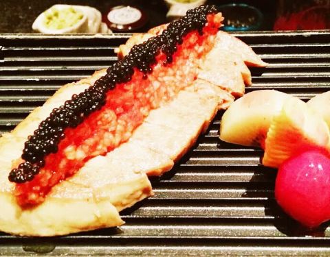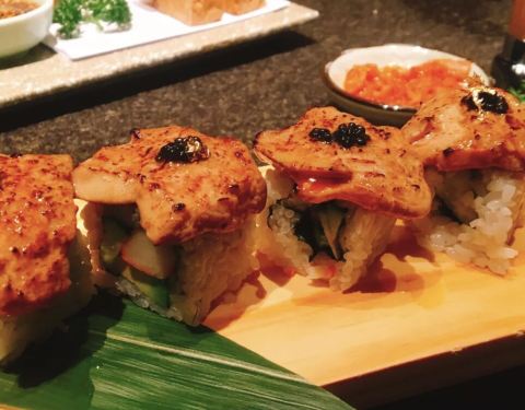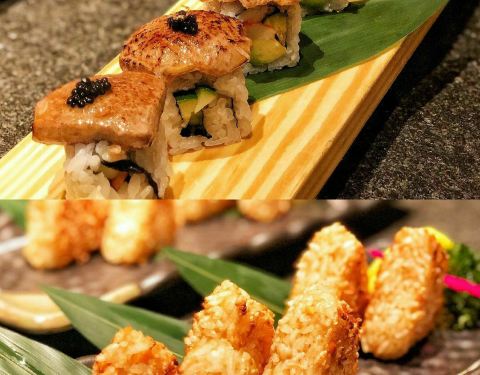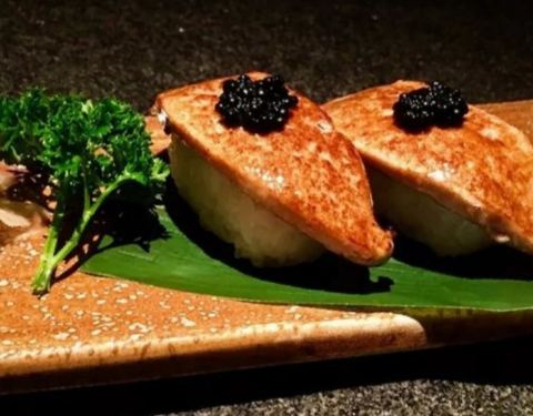 【刺身拼盘】厚切的三文鱼肥美甜润,口感醇厚,入口顺滑。 北极贝也比平时的大,鲜甜汁水也多,不爱吃刺身的基础下都能接受它。 蟹腿肉很精致,点缀的金箔感觉提升了档次,蟹腿肉完整的出壳,一咬,满足整个味蕾的感觉。 【牡丹虾】虾中极品的牡丹虾,做刺身口感最佳,每一只都很大,属于脱衣有肉,味道甜美,口感丰富,软嫩,平均60¥一只。 【生烤牛肉】半生不熟的样子约2分熟,牛肉很薄,中间是生的,可以清晰看出雪花纹,生牛肉口感很独特,可以细细品尝一番。 【鲷鱼薄切】摆盘很精致,鲷鱼切的非常的薄,刀工了得,入口没有腥味,口感滑嫩,很爽脆。 【海螺】海螺有叉子可以剃出来,旋转一下,很肥的一块肉就转出来了,不过听过有些部分不能吃。海螺肉有劲道,原汁原味真好吃。 【黑鲔鱼下巴】黑鲔鱼的肉是日料中的极品,而下巴多用来作为炭烤。刚开始看到以为是一块很肥的猪牛肉之类的。这么肥的鲔鱼,吃起来一点都不腻,肉质鲜美,推荐! 【法式鹅肝】鲜嫩欲滴的鹅肝吃下去在口中融化,细腻如奶油,夹的时候要小心一点,真怕她嫩化了。 【碳烤牛排】炭烤的东西都好吃,牛排很嫩,多汁,要趁热吃~搭配着他家的酱。 【烤鳗鱼】吃日料怎么能少的了鳗鱼呢,现烤的鳗鱼热热烫烫,富含油脂感的鳗鱼,在舌尖慢慢融化,好吃极了。 【日式鳗鱼饭】酱汁拌饭没有鳗鱼我也能吃的很香,很有食欲。鳗鱼不腥,也没什么刺,小孩老人都适合吃。 【鹅肝黑鱼籽卷】鹅肝跟米饭搭配更美味了!油脂在口中爆开来,现在想起它还是觉得超满足,味道香浓,入口即化。 【酱烤鲑鱼饭团】在日本吃过便利店的鲑鱼饭团很好吃耶。酱烤的表皮很硬,像锅巴,饭团要趁热,约冷越硬。