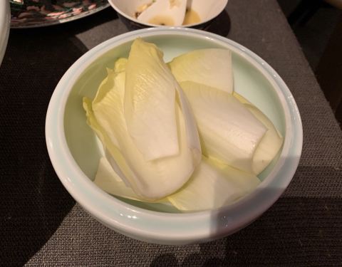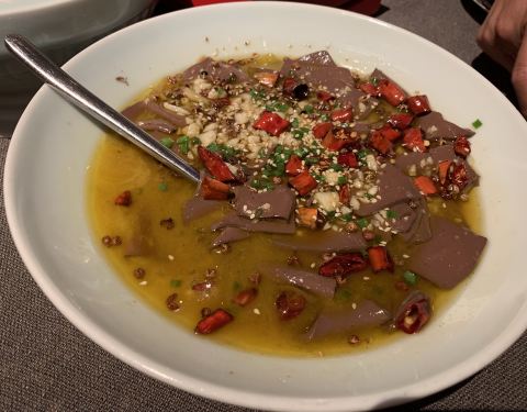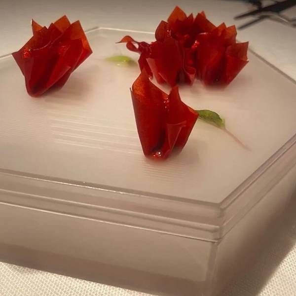 这道菜可以说是前菜中的爆款,但是,身为一个普通人,真的没有辣么优雅讲究!刚上桌我还以为是什么肠子,在再三确认后,是的他真的是带鱼,只不过颠覆传统造型,很有创意。味道有点像熏鱼,口感干爽酥脆,味道酸酸的,不油腻,即使凉透了口感也没有破坏。