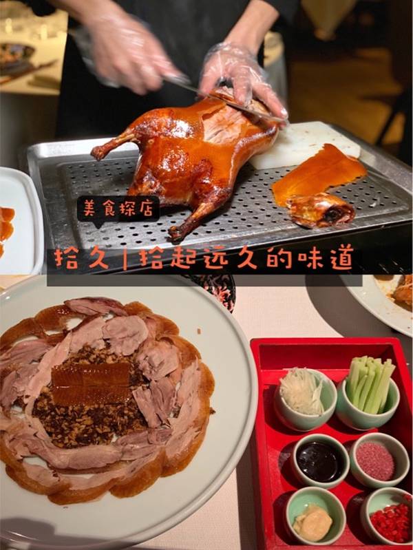 周末家宴聚餐,选在米其林一星的拾久新京菜餐厅。拾久的新京菜既保留了老北京传统美食灵魂,菜品又有改良创新,同时服务周到,有温暖感的餐厅。菜品在原本经典京菜的基础上,吸收融合各大菜系的精华,加以改良,...周末家宴聚餐,选在米其林一星的拾久新京菜餐厅。拾久的新京菜既保留了老北京传统美食灵魂,菜品又有改良创新,同时服务周到,有温暖感的餐厅。菜品在原本经典京菜的基础上,吸收融合各大菜系的精华,加以改良,形成了自己“新京菜”的特色。整体五颗星 凉菜 【捞汁海蜇头】69元 海蜇头香花一样绽放,新鲜有韧劲,搭配芹菜、木耳、洋葱, 十分爽脆、酸甜口儿,算是开胃菜。 【手制山楂鹅肝】39元 精致的山楂酱薄皮里是细腻的鹅肝, 酷似小时候吃的果丹皮包裹着鹅肝。 一口吃下去~外皮酸甜,鹅肝也不会觉得腻。 【老北京麻酱菠菜】29元 这道麻酱菠菜做的精致, 拌菠菜呈现得是菠菜堆, 造型份量正好一口一个。 上边是炸过的红薯丝,酥酥脆脆。 两种口感混合在一起,再加上麻酱的香味, 会让人忍不住想再吃一个! 【意大利黑醋汁带鱼】79元 带鱼去骨,围成卷炸制,造型酷似九转大肠。 带鱼无刺酥脆不留油,意大利黑醋代替普通的糖 醋调味,酸中带甜的口感,不油不腻,好吃的停不下来! 热菜 【茉莉花香烤鸭】招牌菜 129元 师傅刀法娴熟,鸭子片完 码放在鸭松上, 底下烛火加热,有淡淡的茉莉花香味, 小料放在宫廷范儿的百宝箱里。 说说一鸭三吃的方法: ·鸭皮蘸着玫瑰糖吃,酥香可口; ·鸭肉卷在薄如纸的鸭饼中,传统荷叶饼吃法; ·鸭肉和松子炒出来的鸭菘,卷在玉兰菜里吃。 【葱烧千岛湖鱼头】招牌菜 239元 鱼头端上来的时候,专门介绍来自于千岛湖。 与鲜嫩鱼头搭配的不是烙饼而是酥脆的油条,绝了!盘中虽有辣椒,但其实辣味并不突出,只起到调味儿的作用,口味酱香浓郁带甜口。 【茉莉酥皮虾】86元 虾开背开的很好,虾线处理的干净,炸的火候得当。酥脆的外皮浇汁儿后包裹着杏仁碎,鲜香可口。 【宫廷烧烩爪尖】169元 猪蹄经过卤制后脱骨,切成丁后油炸, 与海参一起加入高汤烩制,软烂入味。 【拔丝猫山王榴莲】59元 爱吃榴莲的小伙伴不可错过这道拔丝榴莲! 蜜糖包裹着香甜软绵的猫山王榴莲肉, 炸至外层酥脆,入口外脆内软,香甜软糯。